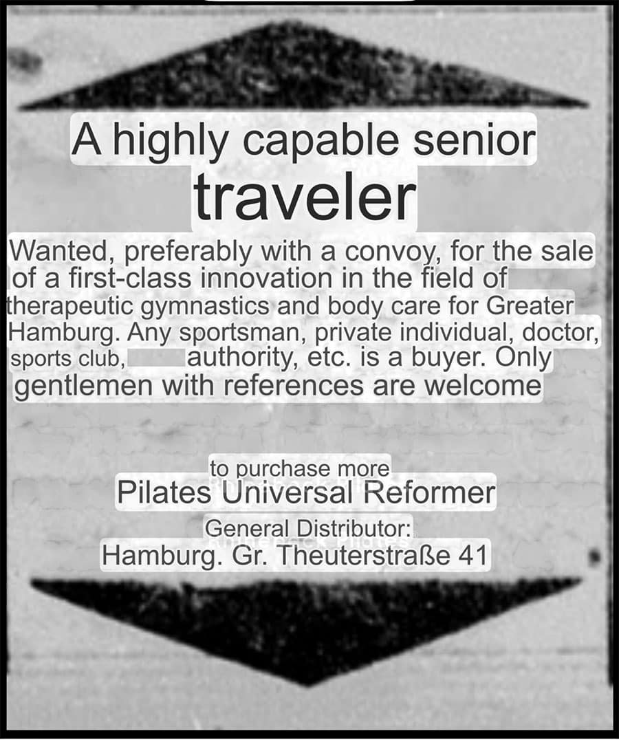 This ad was placed in Hamburg, Germany, where Joe resided at the time. We know that he was teaching his method on the reformer, as well as boxing, and was also the trainer for the Hamburg Police. Images first shared 10/19/2025.