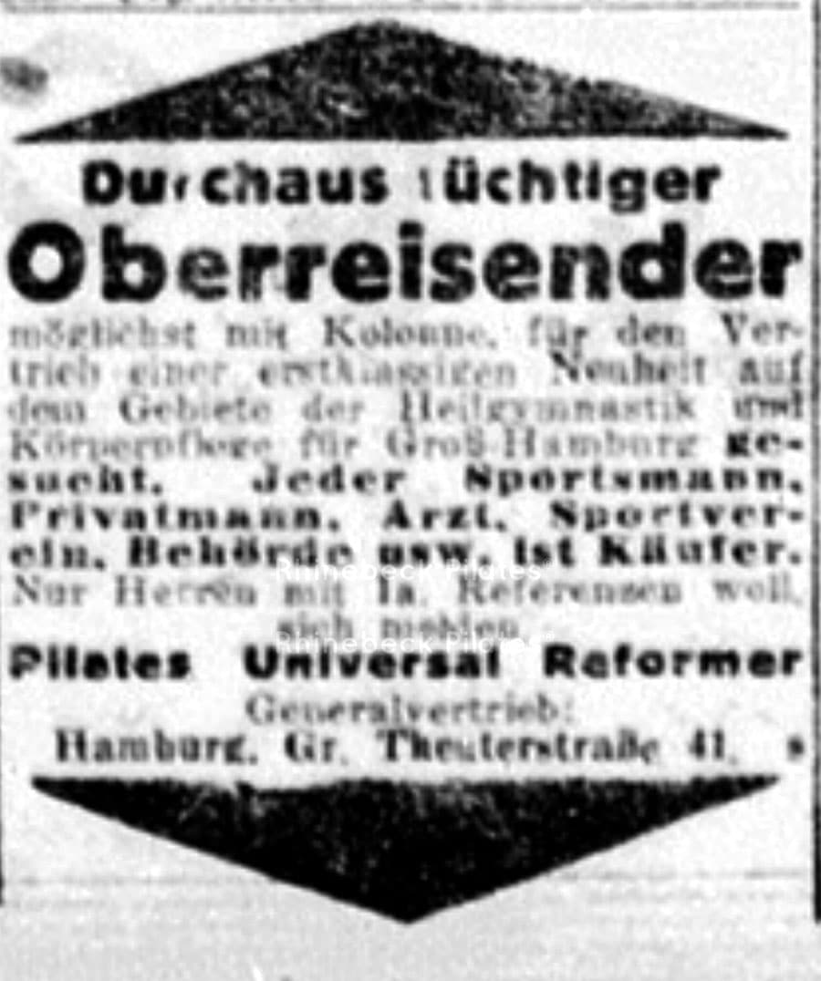 It is very difficult to find any written documentation of Joe Pilates teaching anything in Hamburg, although we know he lived there from 1923-1926 and taught boxing and the early forms of Contrology. We even know that he had at least one reformer there and was also trying to sell them. But at the same time, there is very little documentation of anything specific that Joe was teaching or doing in Hamburg.