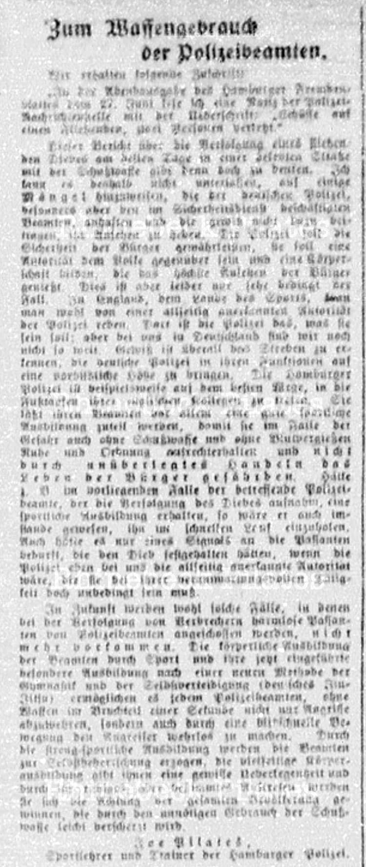 Through my extensive research, I have found this letter written to the local Hamburg newspaper, written by Joseph Pilates in 1924. In the letter, he mentions that soon the police force will not have to use weapons because he is teaching them Jui Jitzu. The letter was signed, Joe Pilates, Sports Instructor and Trainer of the Hamburg Police.